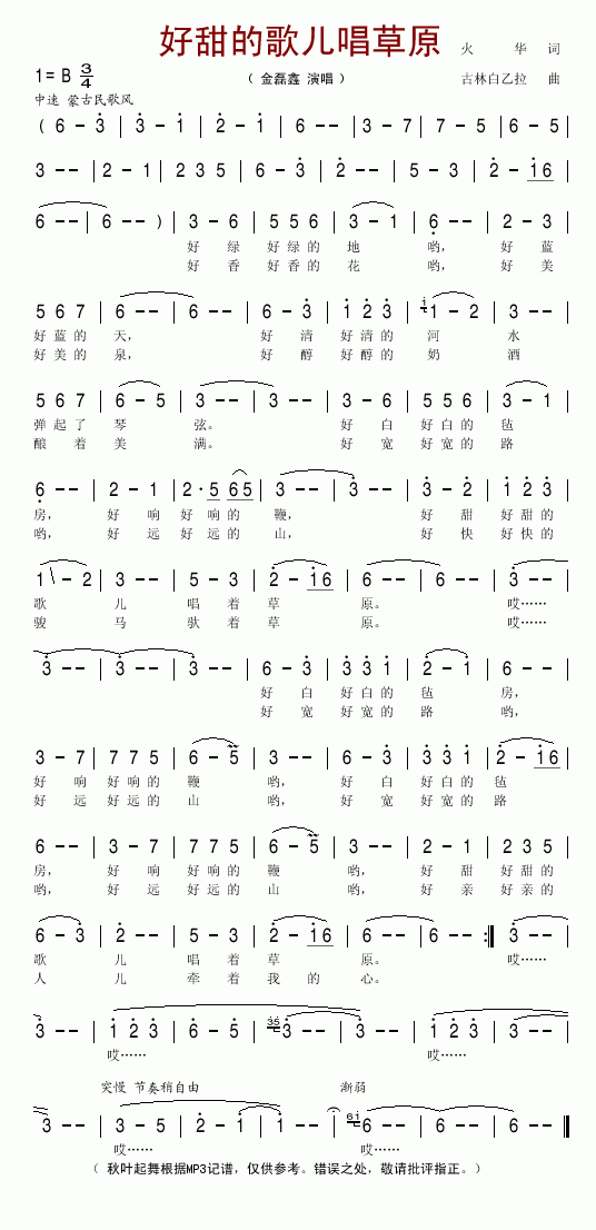 好甜的歌儿唱草原-金磊鑫(简谱)