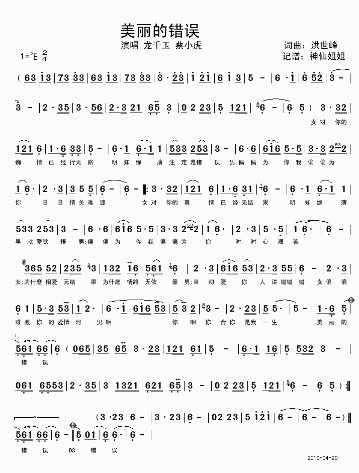 >> 美丽的错误-龙千玉 蔡小虎(简谱)