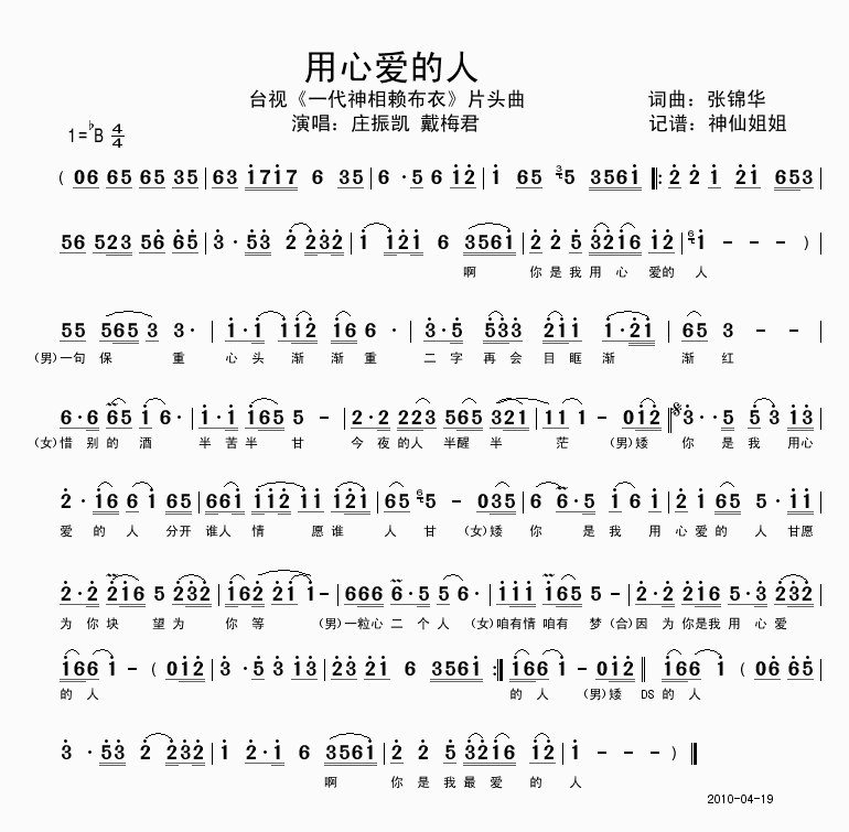 >> 用心爱的人-庄振凯 戴梅君(台视《一代神相赖布衣》片头曲简谱)
