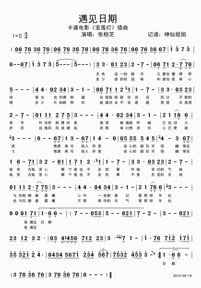 >> 遇见日期-张柏芝(卡通电影《宝莲灯》插曲简谱)