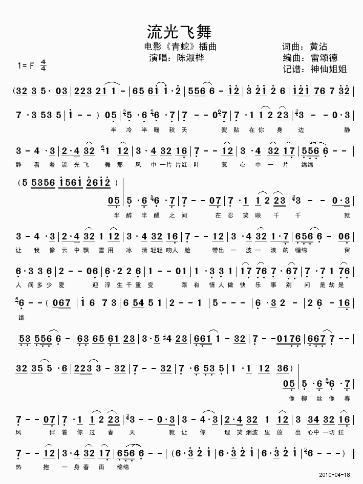 流光飞舞-陈淑桦(电影《青蛇》插曲简谱)