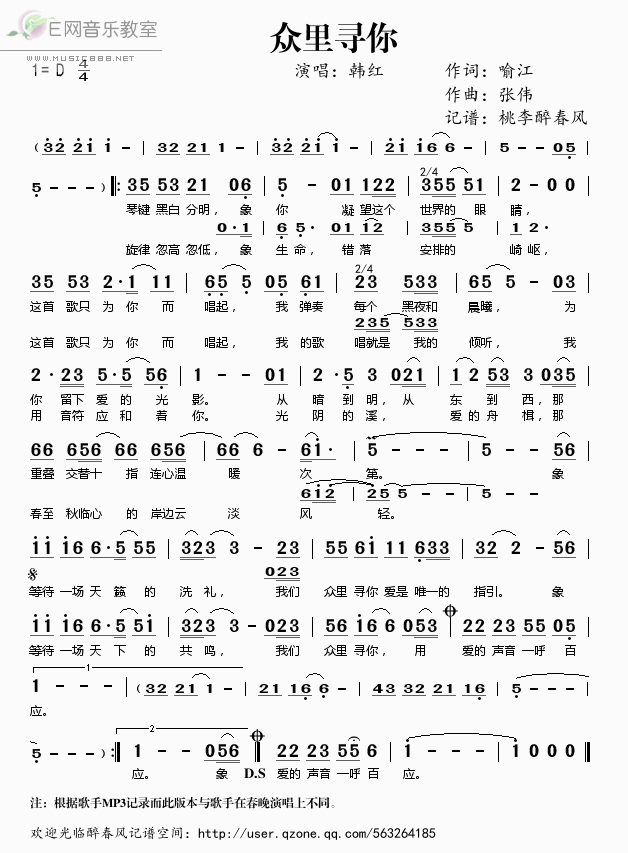 >> 众里寻你(2011春晚歌曲)——韩红(简谱)