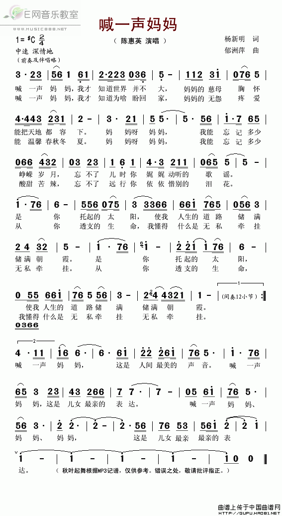 >> 喊一声妈妈-陈惠英(简谱)