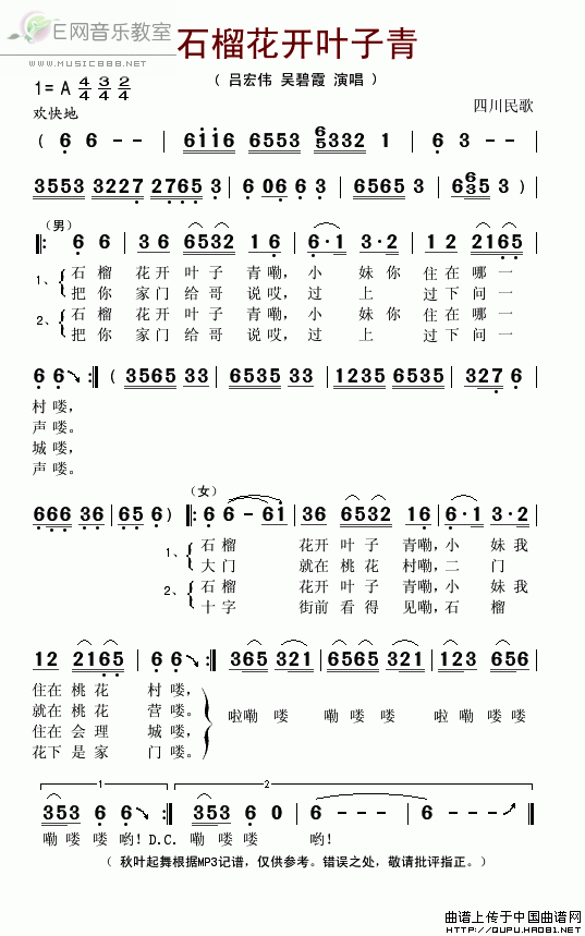 >> 石榴花开叶子青-吕宏伟 吴碧霞(简谱)