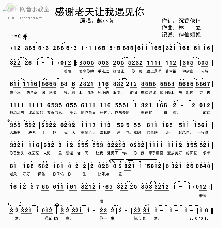 >> 感谢老天让我遇见你-赵小南(简谱)
