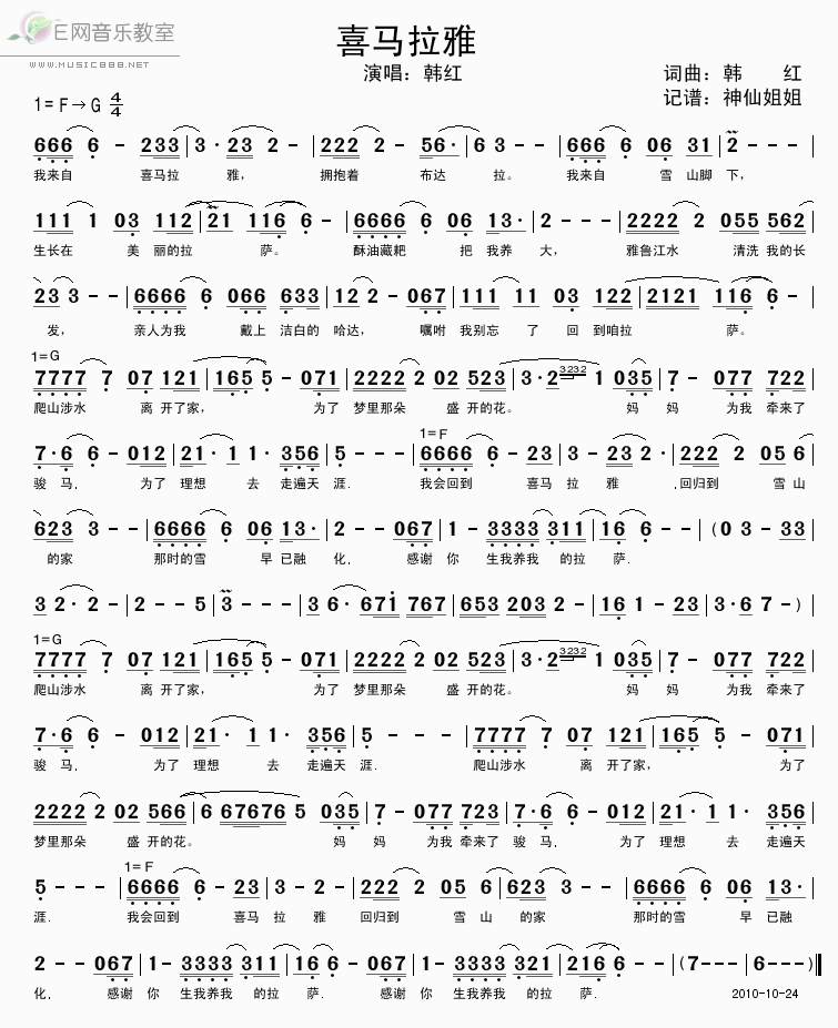 >> 喜马拉雅-韩红(简谱)