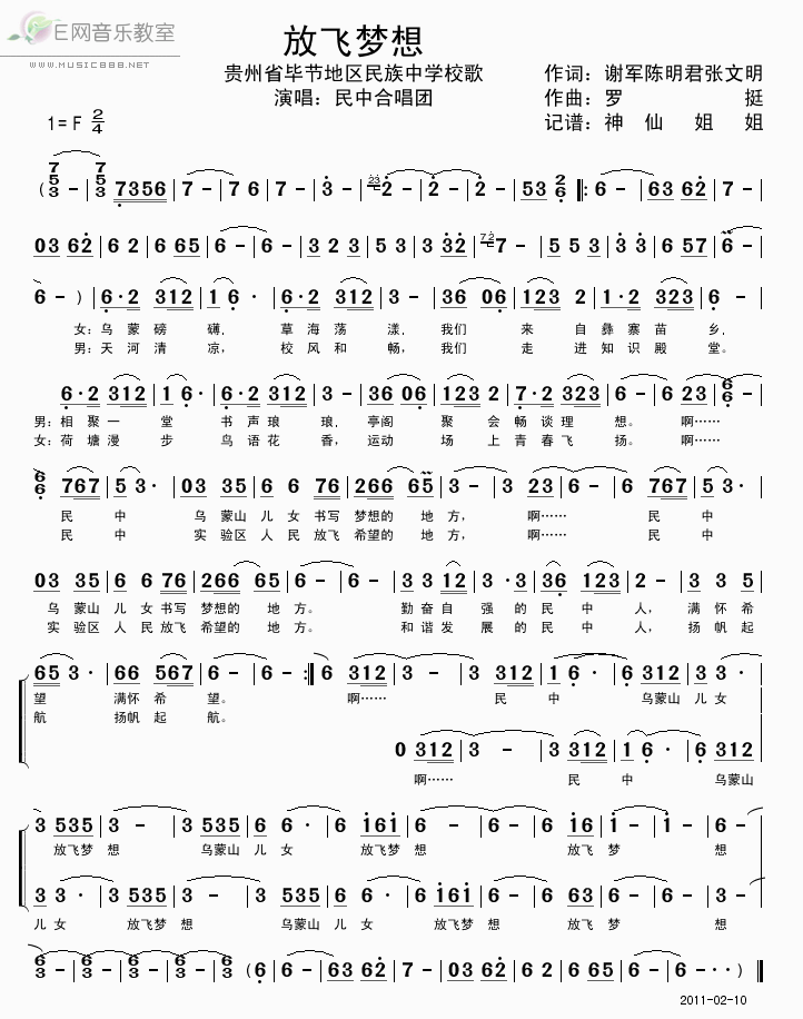 >> 放飞梦想-贵州毕节民族中学校歌(简谱)