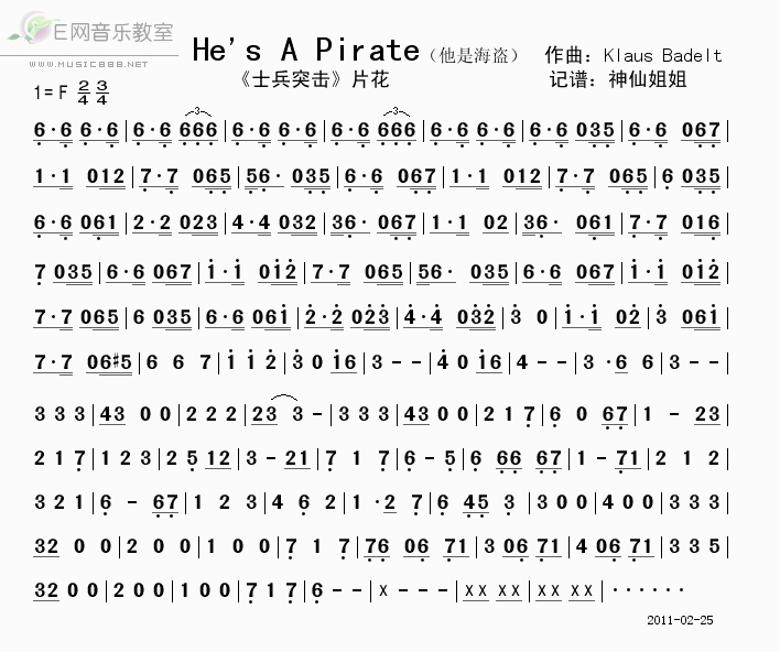 >> He's A Pirate(他是海盗)-《士兵突击》片花(简谱)