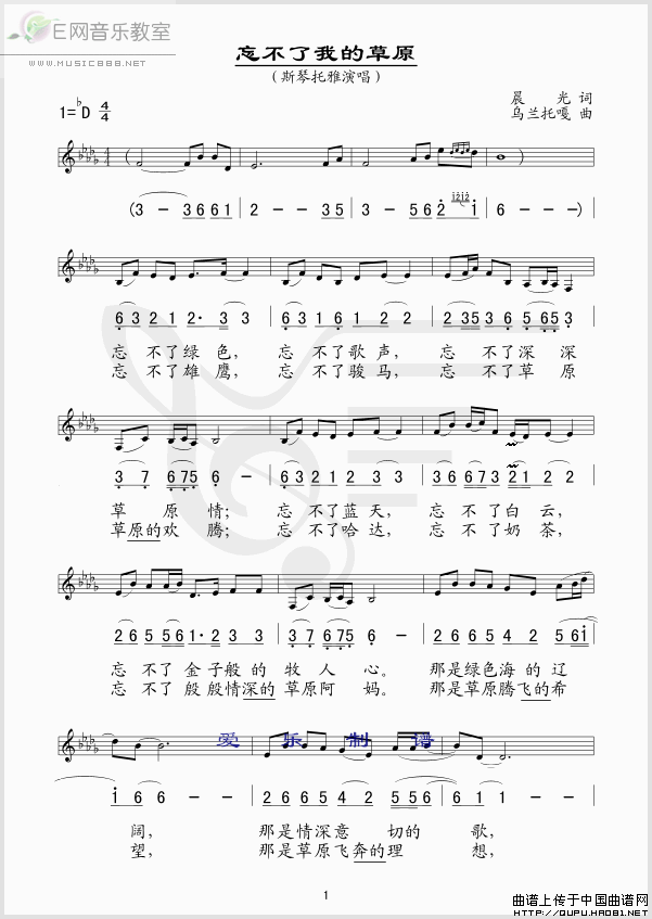 >> 忘不了我的草原-斯琴托雅(简谱+线谱)