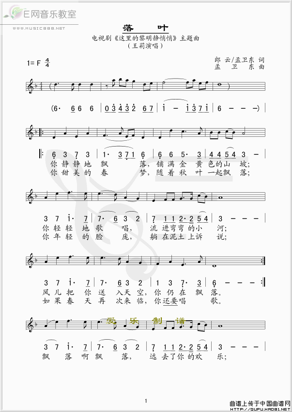 >> 落叶-王莉(《这里的黎明静悄悄》主题歌简谱+线谱)