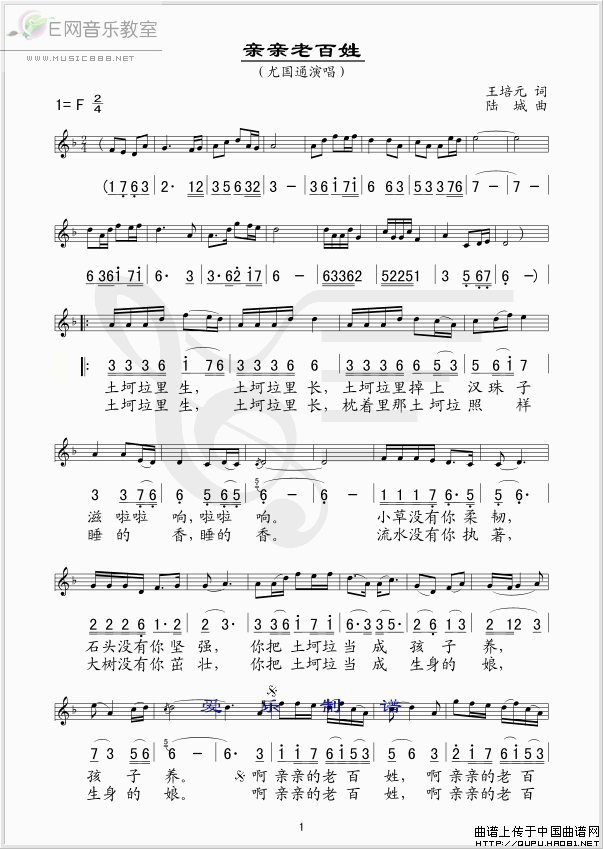 >> 亲亲老百姓-尤国通(简谱+线谱)