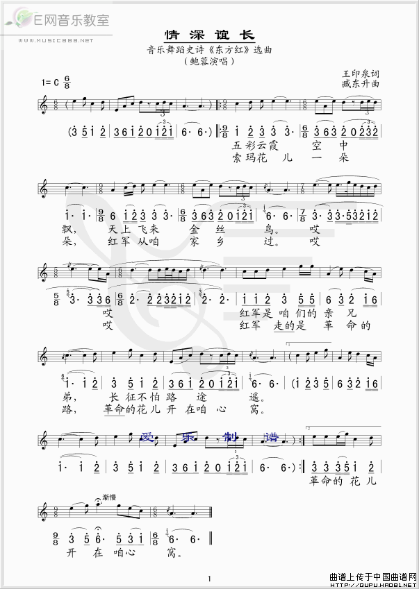>> 情深谊长-鲍蓉(音乐舞蹈史诗《东方红》选曲简谱+线谱)