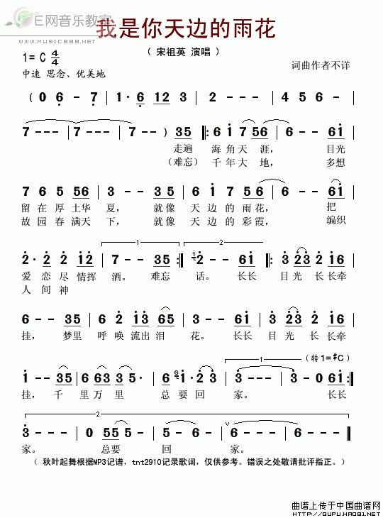 走遍海角天涯 目光留在厚土华夏就像天边的雨花 把爱恋尽情挥洒难忘千年大地 多想故园春满天下就像天边的彩霞 编织人间神话长长目光长长牵挂 梦里呼唤流出泪花长长目光长长牵挂 千里万里总要回家