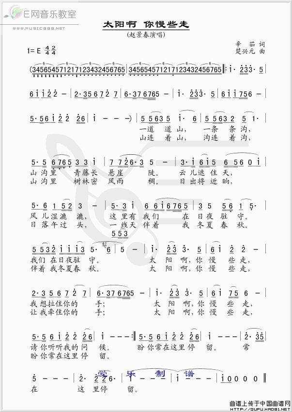 >> 太阳啊你慢些走-赵景春(简谱)
