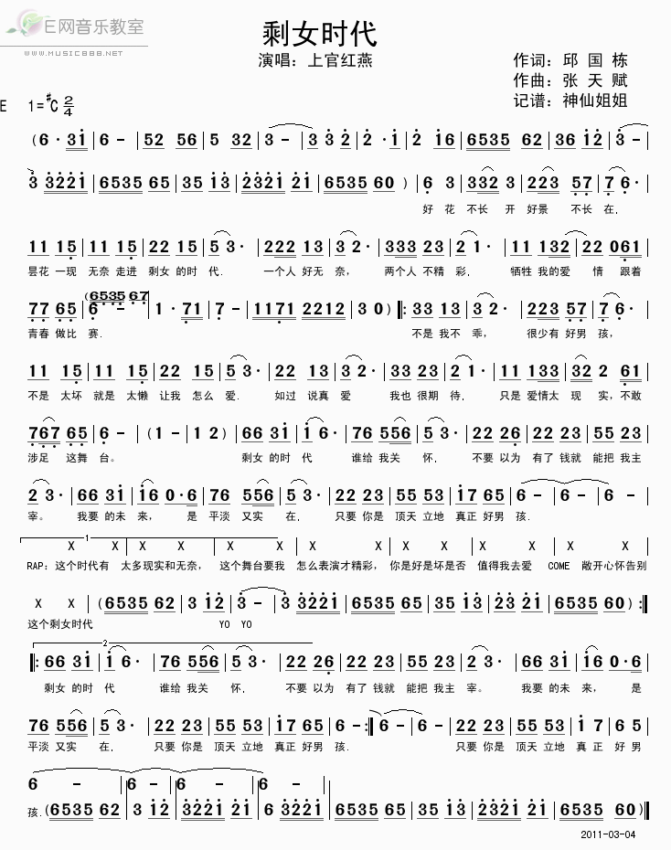 剩女时代-上官红燕(简谱 歌谱 歌曲简谱 合唱简谱 影视简谱)
