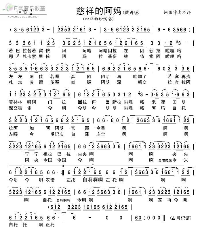 >> 慈祥的阿妈-四郎曲珍(藏语版简谱)