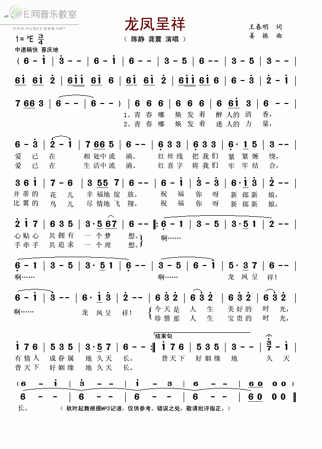 >> 龙凤呈祥-陈静 龚震(简谱)