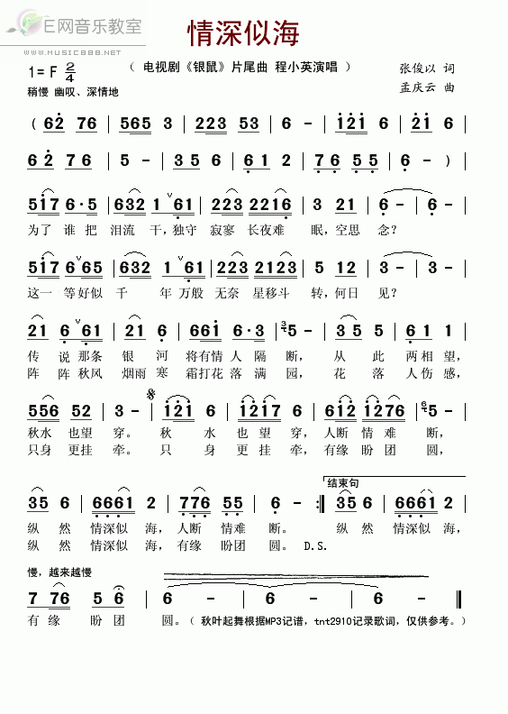 >> 情深似海-程晓英(电视剧《银鼠》片尾曲简谱)