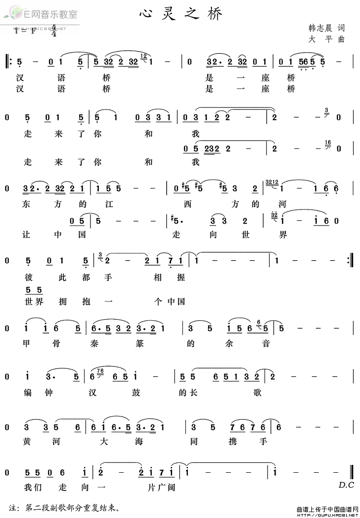 >> 心灵之桥-杭杨 孙霄楠(世界汉语桥主题歌简谱)