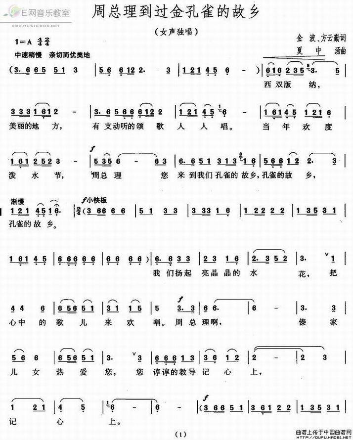 >> 周总理到过金孔雀的故乡-女声独唱(简谱)