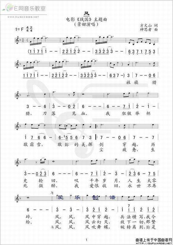 >> 风-景甜(电影《战国》主题曲简谱+线谱)