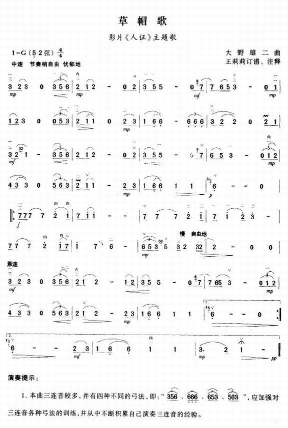 >> 草帽歌-电影《人证》主题歌(二胡曲谱)