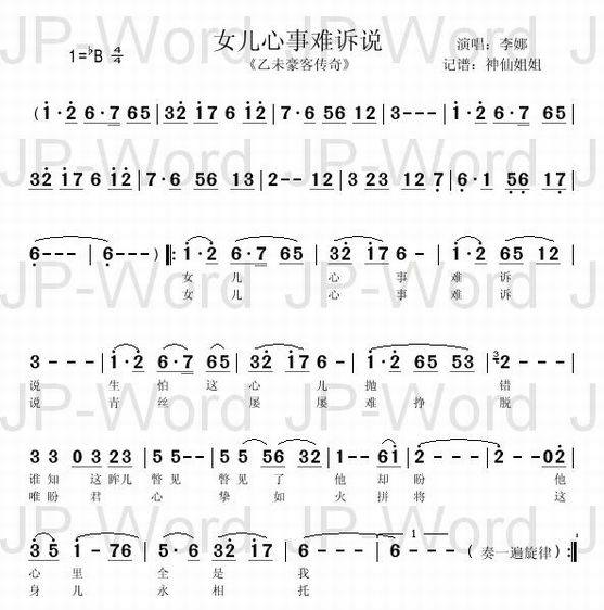 >> 女儿心事难诉说-李娜(《乙未豪客传奇》插曲简谱)