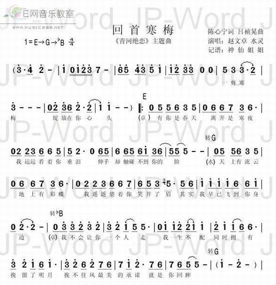 >> 回首寒梅-赵文卓 水灵(《青河绝恋》主题曲简谱)