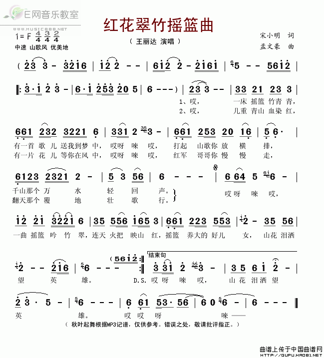 | 《红花翠竹摇篮曲》 作词:宋小明 作曲:孟文豪 演唱:王丽达 哎 一床摇篮竹青青 有一首歌儿送我到梦中 哎呀唻哎 打起山歌你放慢排 千山那个万水回四声 哎呀唻哎 哎 几重青山血染红 有一片花儿等你在风中 哎呀唻哎 红军哥哥你慢慢走 翻天那个覆地壮歌行 哎呀唻哎 哎 一曲摇篮吟竹翠 连天火把映山红 摇篮养大的好儿女 山花泪洒望英雄 哎呀唻哎 |