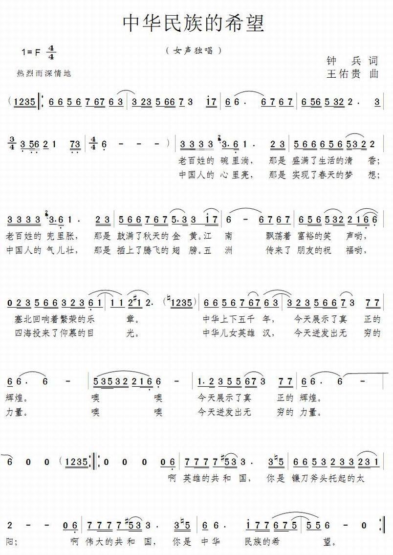 >> 中华民族的希望-女声独唱(简谱)