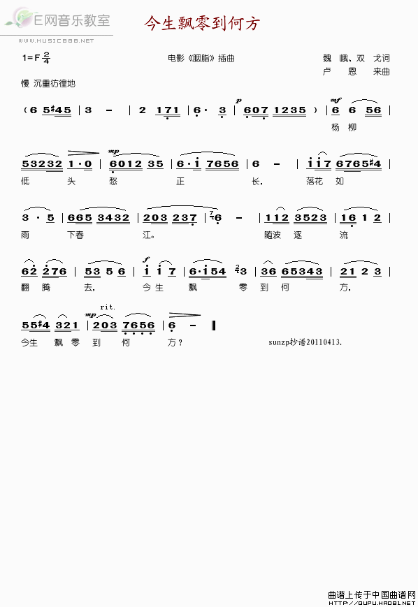 >> 今生飘零到何方-朱逢博(电影《胭脂》插曲简谱)