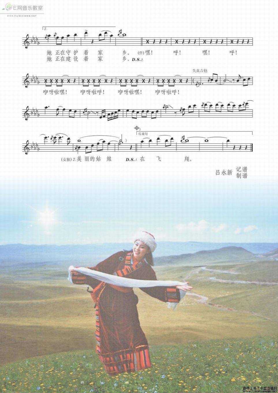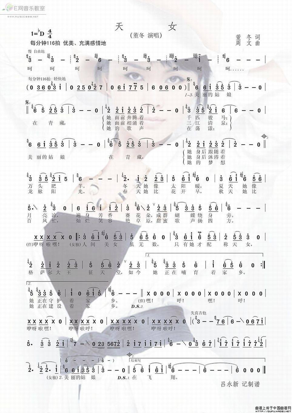 | 《天 女》 Girl Of Tibet 作词:董冬 作曲:周文 演唱:董冬 美丽的姑娘在青藏, 她面前奔腾着千匹骏马, 她身后跟随着万头肥羊; 冬天她像太阳暖, 夏天她像月亮凉; 遍身芳香赛花朵, 成群蝴蝶绕身旁。 美丽的姑娘在青藏, 她面前相涌着三江清泉, 她身后沐浴着龙脉阳光; 春天她比花开早, 秋天她比百凤忙; 灿烂笑容艳草原, 甜蜜歌声扬四方。 人间美女虽无数, 只有她才配称天女; 格萨尔大王征天堂, 如今她正在哺育着家乡。 人间美女虽无数, 只有她才配称天女; 格萨尔大王征天堂, 如今她正在守护着家乡。 人间美女虽无数, 只有她才配称天女; 格萨尔大王征天堂, 如今她正在建设着家乡。 美丽的姑娘在青藏, 她的歌声在荡漾; 美丽的姑娘在青藏, 她的梦想在飞翔。 |