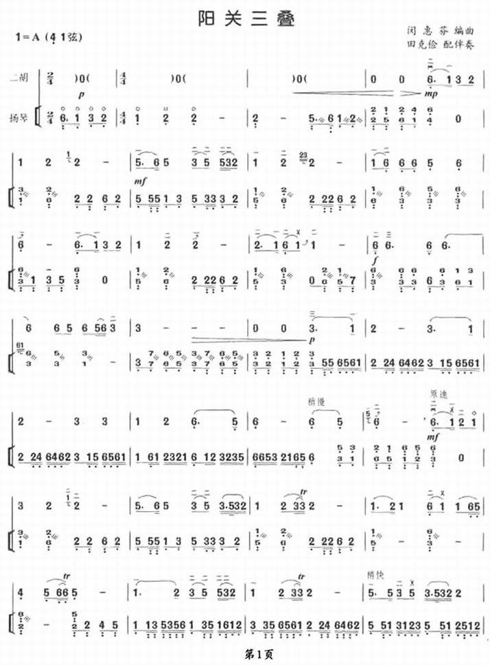 >> 阳关三叠-闵慧芬(二胡曲谱_简谱版本2)