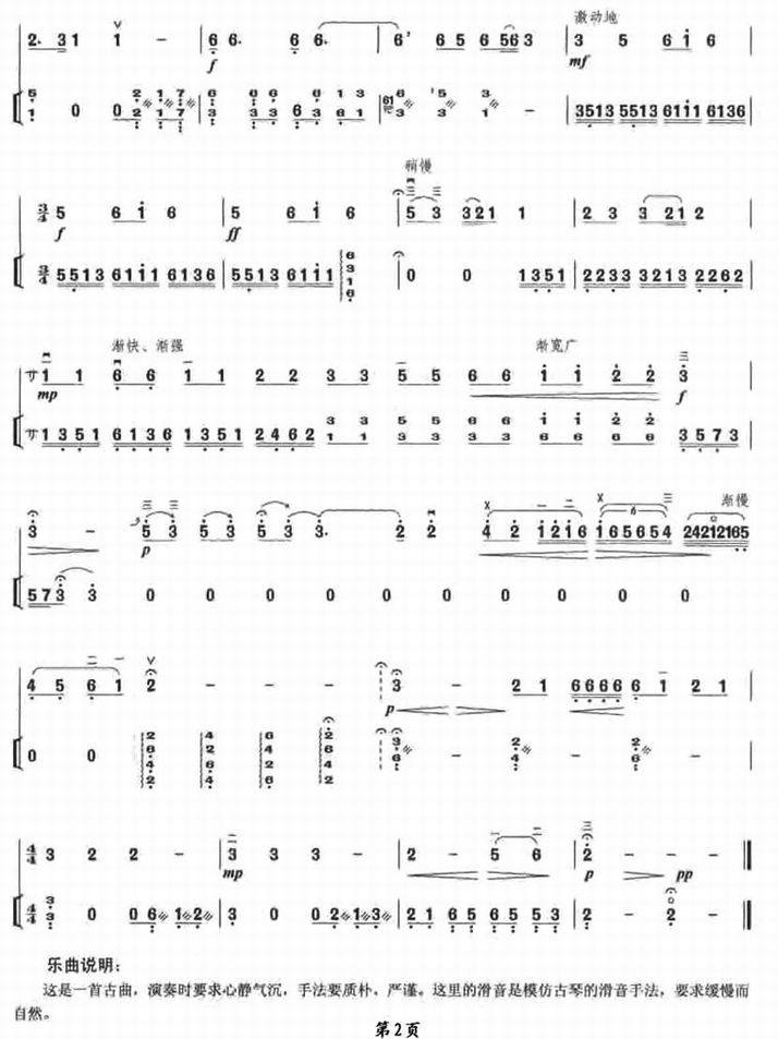 这是一首古曲,演奏时要求心静气沉,手法要质朴、严谨。这里的滑音是模仿古筝的滑音手法,要求缓慢而自然。