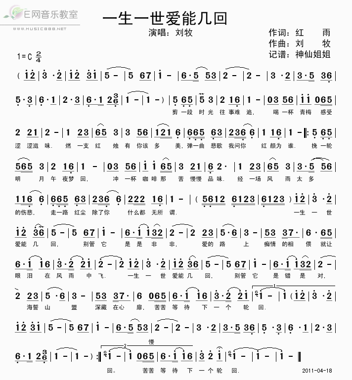 一生一世爱能几回演唱: 刘牧作词:红雨作曲:刘牧 剪一段时光 往事难追 喝一杯青梅 感受涩涩滋味燃一支红烛 有你该多美 弹一曲悲歌 我问你 红颜为谁挽一轮明月 午夜梦回 喝一杯咖啡 那苦慢慢品味 经一场风雨 太多的伤悲 走一路红尘除了你 什么都无所谓一生一世爱能几回 别管他是是非非爱的路上 痴情的相偎 就让眼泪在风雨中飞一生一世爱能几回 别管他是错是对 海誓山盟 深藏在心扉 苦苦等待下一个轮回