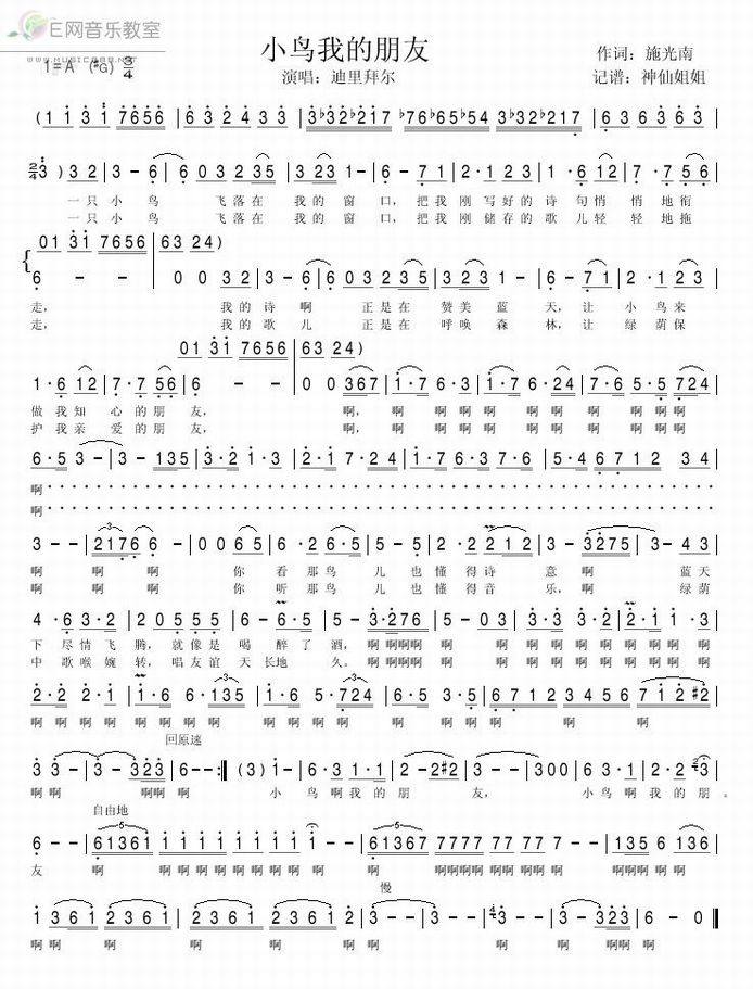 >> 小鸟我的朋友-迪里拜尔(简谱)