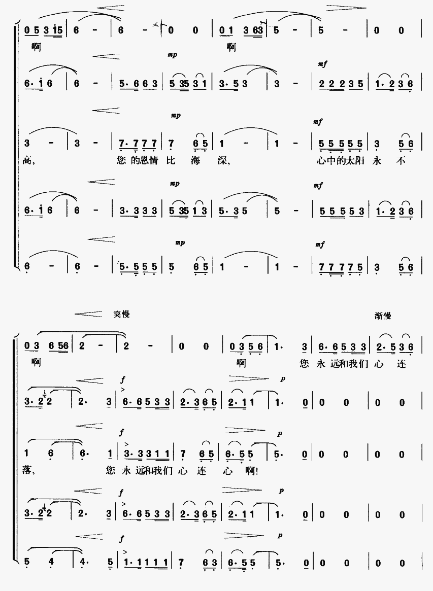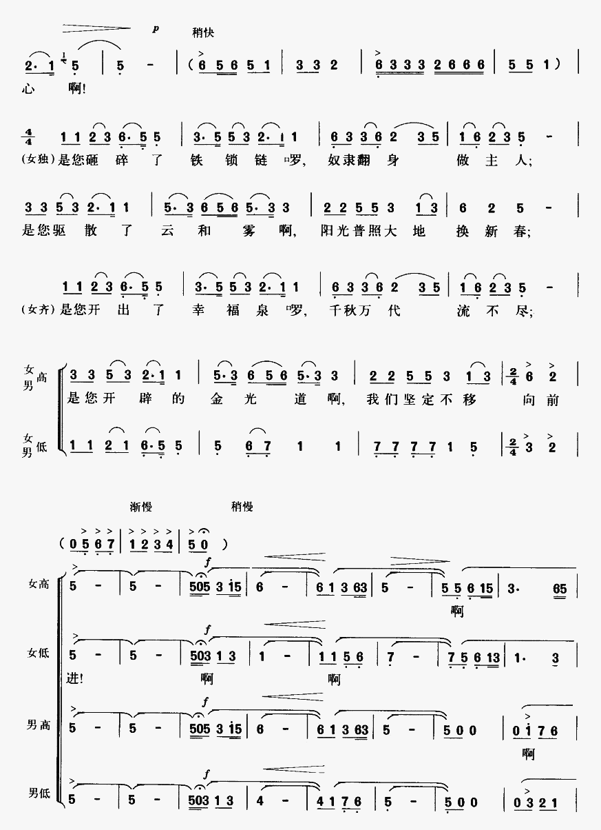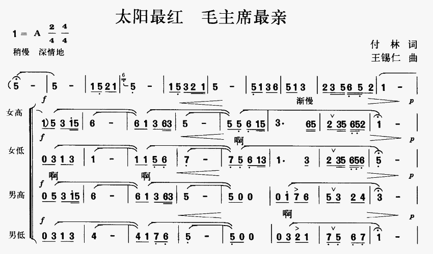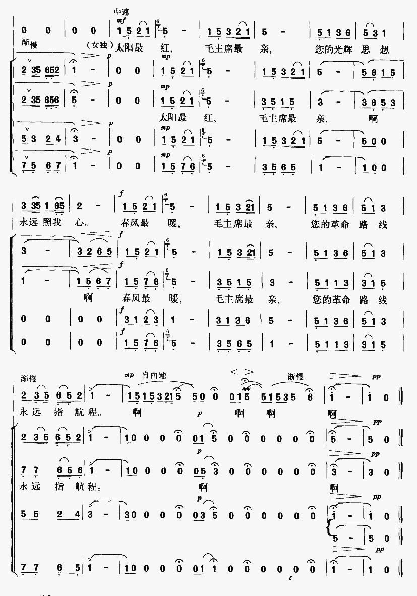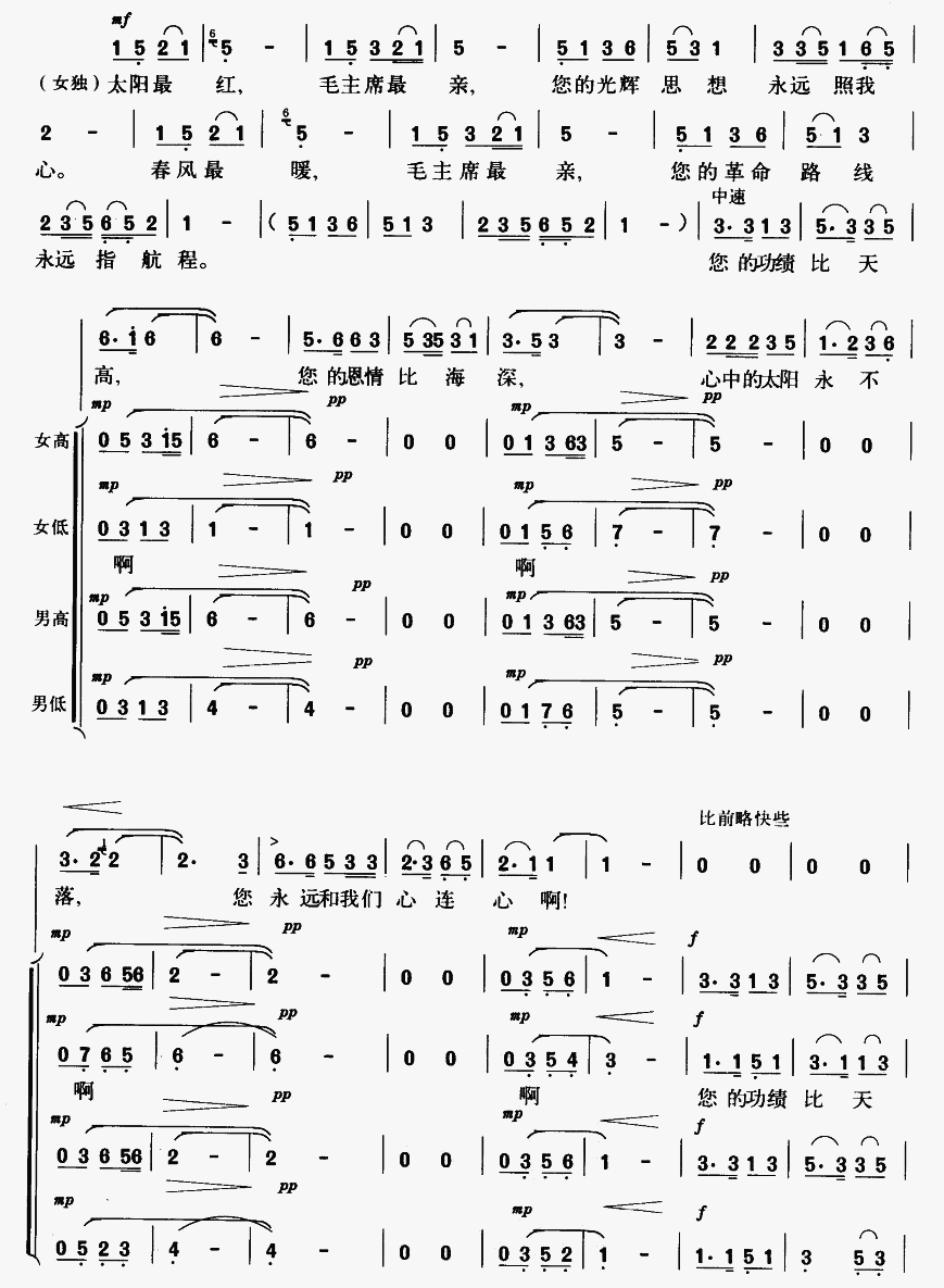 >> 太阳最红毛主席最亲-领唱、合唱(四部混声合唱简谱)