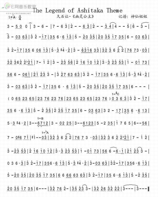 The Legend of Ashitaka Theme -《幽灵公主》(简谱)
