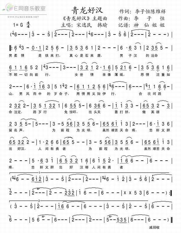 >> 青龙好汉-宋逸民 韩瑜(《青龙好汉》主题曲简谱)