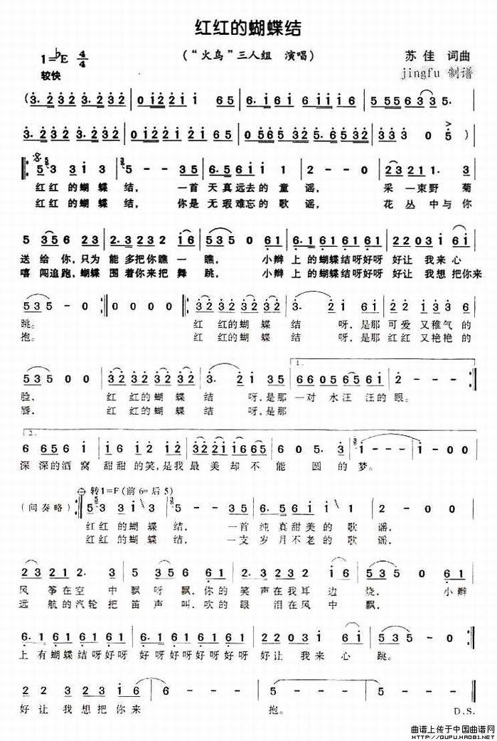 >> 红红的蝴蝶结-火鸟三人组(简谱)