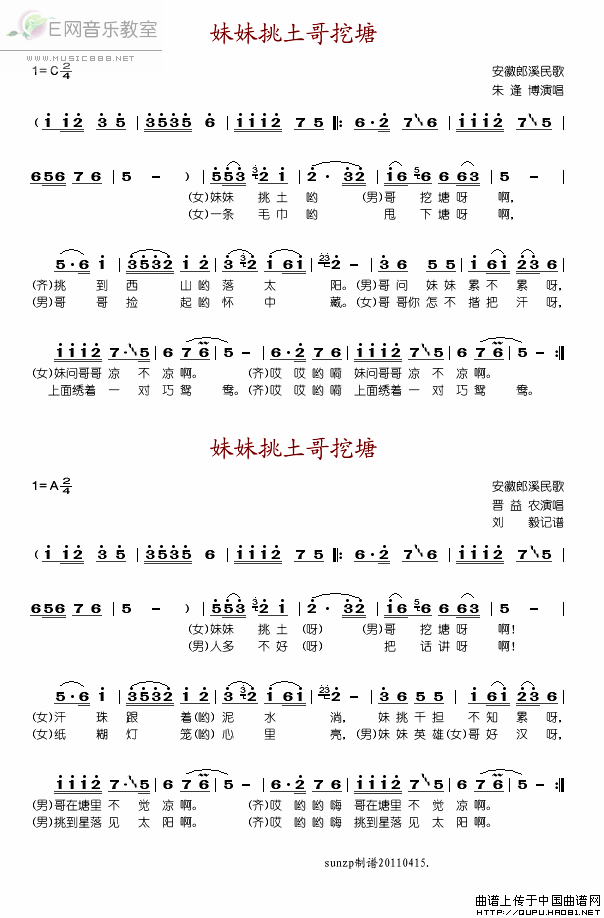 >> 妹妹挑土哥挖塘-朱逢博(安徽民歌简谱)