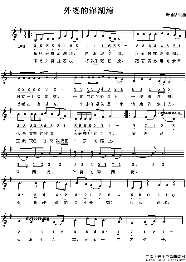 >> 外婆的澎湖湾-叶佳修(简谱+线谱)