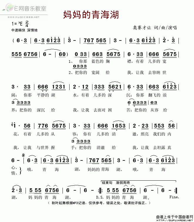>> 妈妈的青海湖-奥赛才让(简谱)