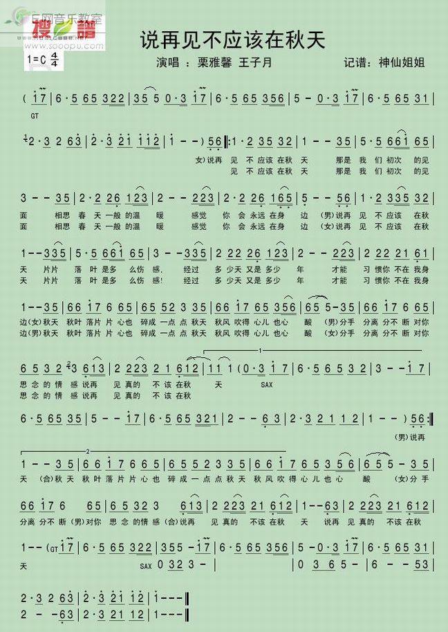 >> 说再见不应该在秋天-栗雅馨 王子月(简谱)