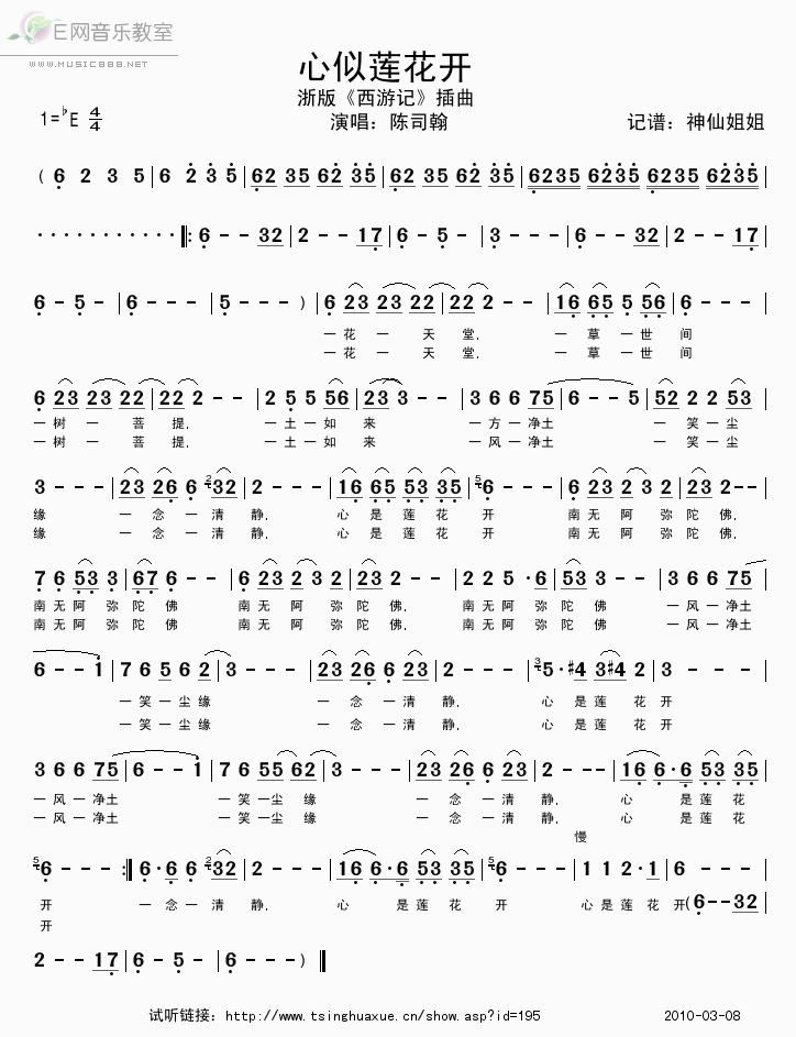 >> 心似莲花开-陈司翰(浙版《西游记》插曲简谱)