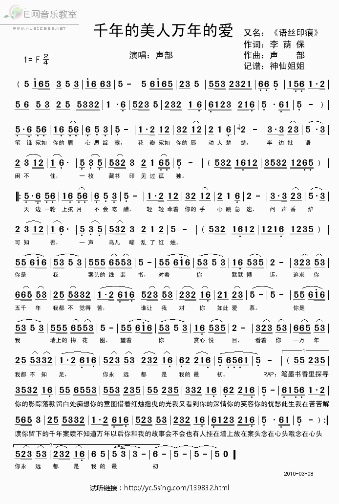 >> 千年的美人万年的爱/语丝印痕-声部(简谱)