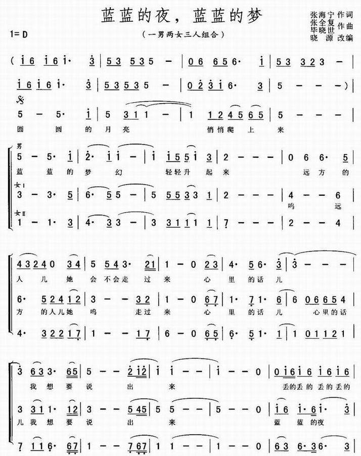 蓝蓝的夜蓝蓝的梦-男女声三重唱(三声部简谱)