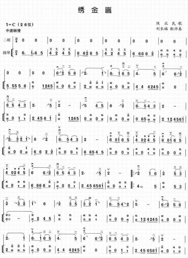 >> 绣金匾-陕北民歌(二胡曲谱_简谱带扬琴伴奏)
