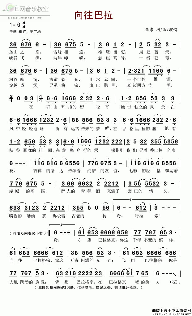 美丽的康巴姑娘-亚东(简谱+线谱)