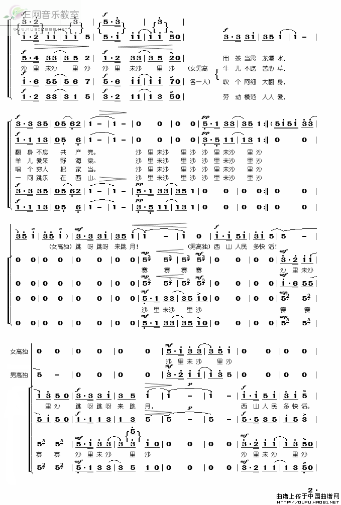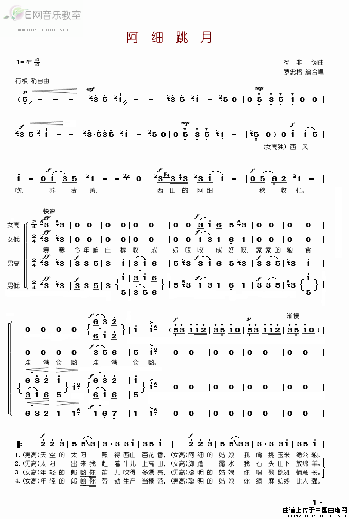>> 阿细跳月-国防文工团合唱队(合唱简谱)